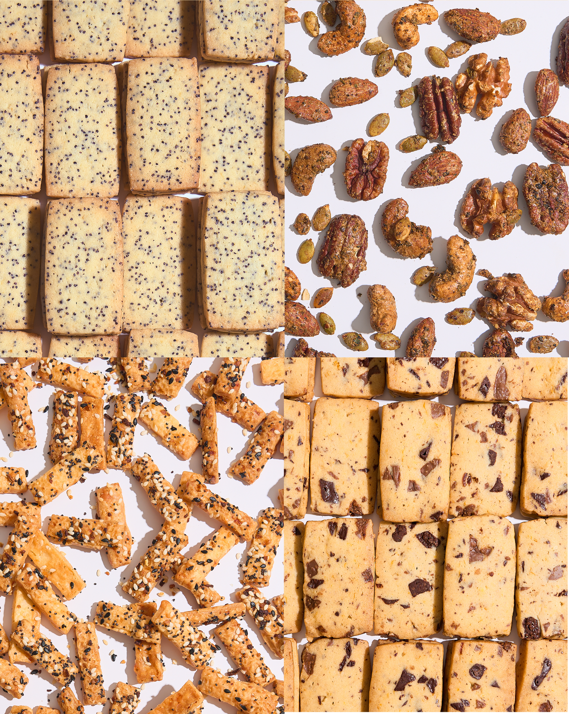 Our Classics Bundle brings together four signature creations that have earned their permanent place in our repertoire: fan favorite Everything Cheddar Crackers, cocktail companion Herb & Urfa Chili Spiced Nuts, zesty Lemon Poppy Seed Shortbread, & the luxuriously aromatic Chocolate Orange Shortbread. Each treat in this curated collection represents what we do best – a celebration of ingredients and craftsmanship.