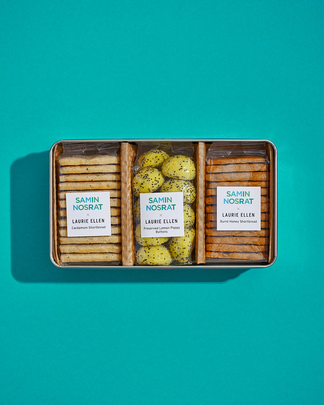 A limited-edition cookie tin celebrating the September release of Samin Nosrat’s second cookbook, Good Things: Recipes and Rituals to Share with People You Love. Inside are three shortbread flavors: one drawn directly from Laurie Ellen’s recipe featured in the book, and two more inspired by recipes from its pages. A longtime collaborator and supporter of Samin, Laurie Ellen created this exclusive collection to honor their partnership and the spirit of sharing at the heart of Good Things.
