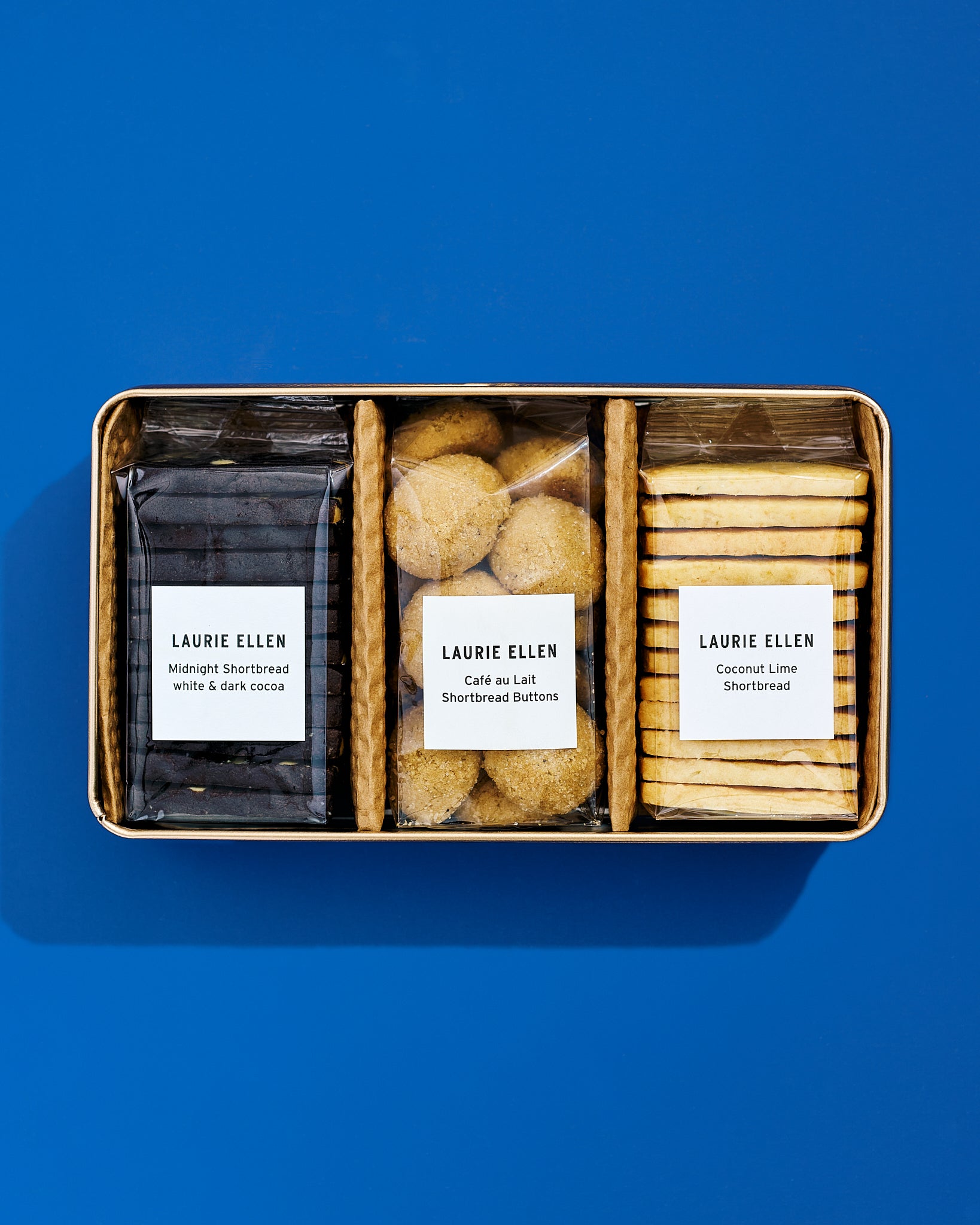Our three seasonal flavors of shortbread beautifully packed into golden gift tins. Inside you'll find Midnight Shortbread, Café au Lait Buttons, and Coconut Lime Shortbread.